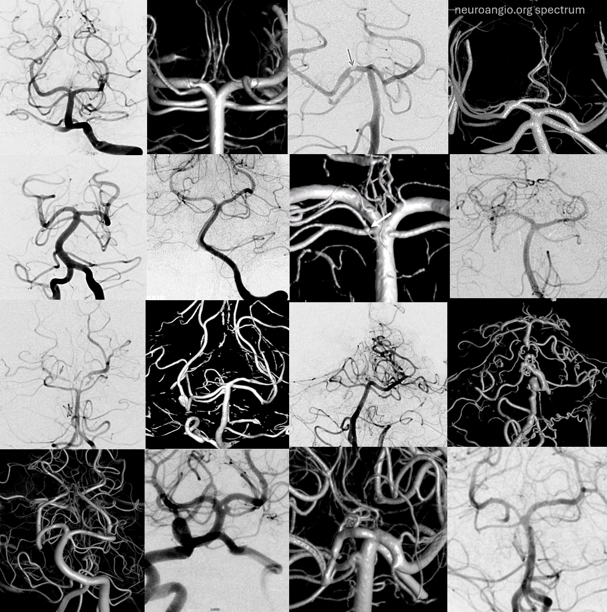 There are basically two divisions. The bifurcation is extremely variable — from very distal to “duplicated” — arising separately from the basilar artery — SPECTRUM again. The vermian branch is almost always the upper one — either more distal when arising from basilar trunk or the upper one when bifurcating from single branch. Below is an example of an SCA fusiform aneurysm. On the right separate origins of vermian (cranial) and hemispheric (caudal) branches. On the left single branch, with upper one being vermian. Best seen in upper right and lower post Rx images. Full case here