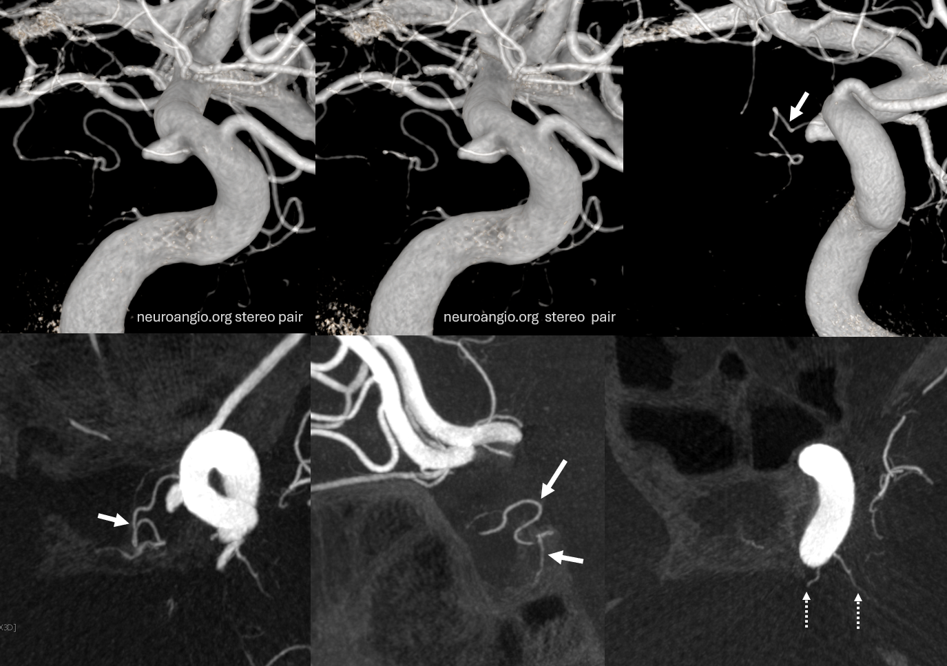 Excellent example of contralateral balance. On the left, there is a hypoplastic posterior hypophyseal network (part of MHT, arrowhead), and a prominent superior hypophyseal artery (associated with a small aneurysm). On the right, the opposite is true — large inferior hypophyseal arteries (dashed arrows) extending past midline due to contralateral hypoplasia, and a smaller superior hypophyseal, without aneurysm — not visible on these VRs, but seen on subsequent MIP images