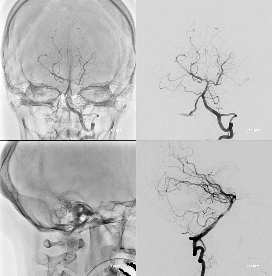 The answer is proximal right CCA. The above CCA injection was done distal to right vert origin. In leftmost image, the catheter is in the “bicarotid trunk” common origin of the CCAs. You see proximal right CCA origin of right vert. The basilar is patent, with flash filling of the SCAs normally supplied by the PCOMs