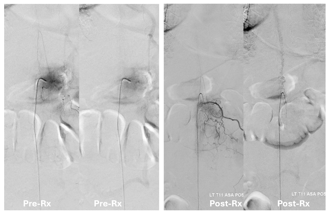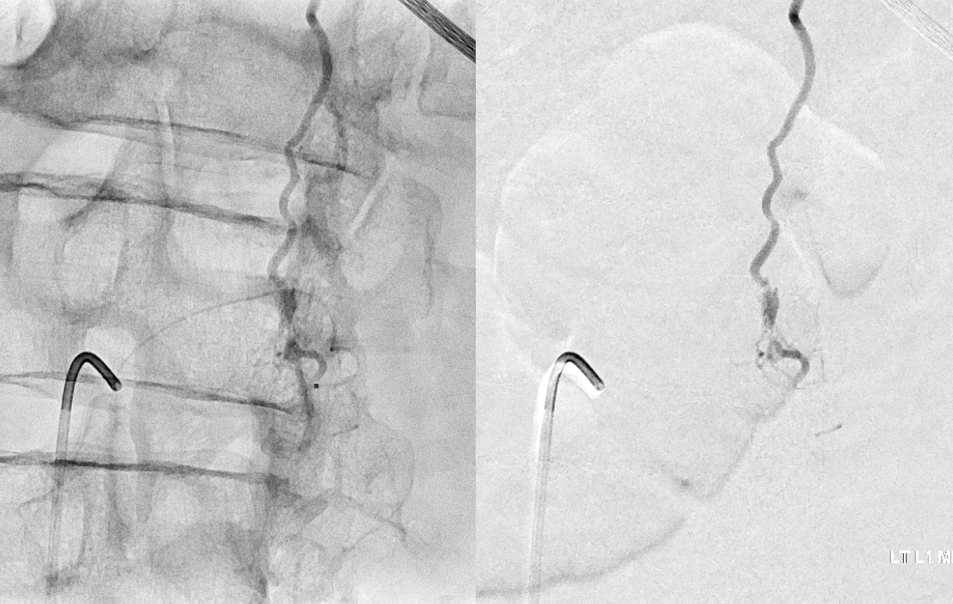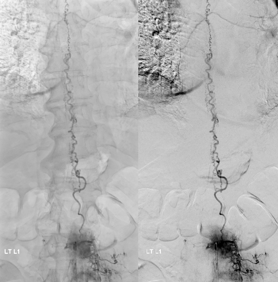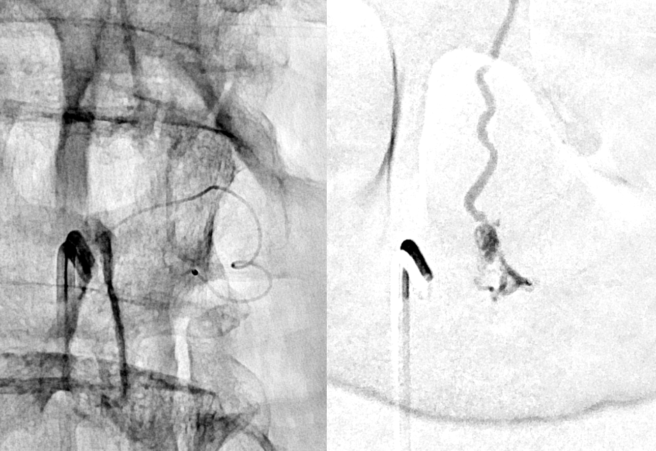 Very important to find both dominant radiculomedullary supply to the lower cord (aka Adamkiewicz) and posterior spinal arteries. In the Adamkiewicz injection, there is usually no venous phase due to fistula-related congestion. In this case, not only we dont see veins, we also don’t see the conus basket. That is frequently seen from posterior spinals, except in this case we did not see posterior spinals either. That is a concern since we don’t want to inadvertently embolize them. However, given the congestion the most likely explanation is that the basket normally opacifies from the Adamkiewicz / ASA, and is congested by fistula.