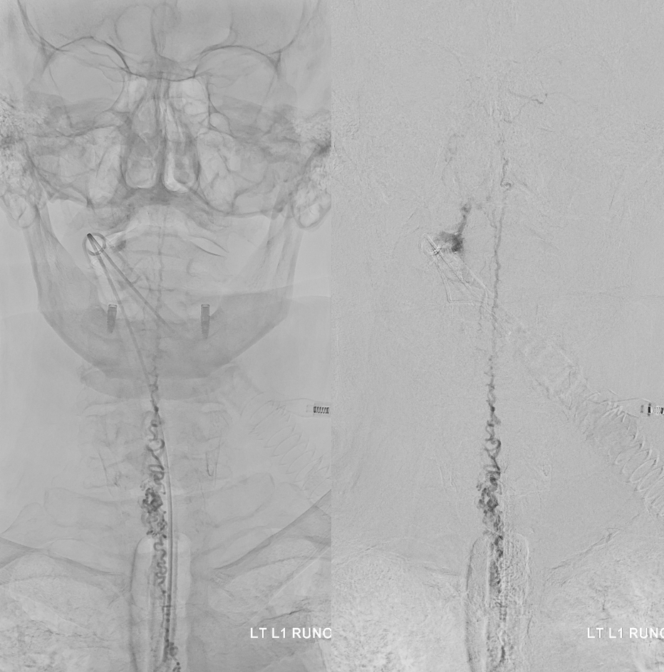 Below is a better position. The fistula is at the level of the ball of vessels above the microcatheter tip. Several tributaries are present, which is not great, as they will tend to polymerize nBCA before it reaches the vein. Fortunately the radicular venous segment is long, before it reaches cord surface veins, so there is a lot of safety. This is not the case with upper thoracic fistulas, and we don’t want to spill glue into cord surface veins. It promotes thrombosis, which is erroneously known as the Foix-Alajouanine syndrome. The actual syndrome was described by Foix and Alajouanine as the clinical end stage of untreated spinal dural fistulas — ascending paralysis, followed by respiratory dysfunction, aspiration, and death. It was not an iatrogenic problem. The name was adopted to describe post-treatment acute deterioration due to thrombosis of enlarged cord veins after closure of the fistula and reduction of venous flow, in part because clinical presentation is comparably horrible. Typically happens some 6-12 hours after treatment, and almost always within 24 hours. Treatment is with aggressive emergent anticoagulation, and outcome is variable.