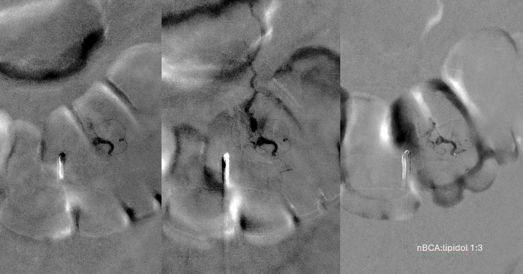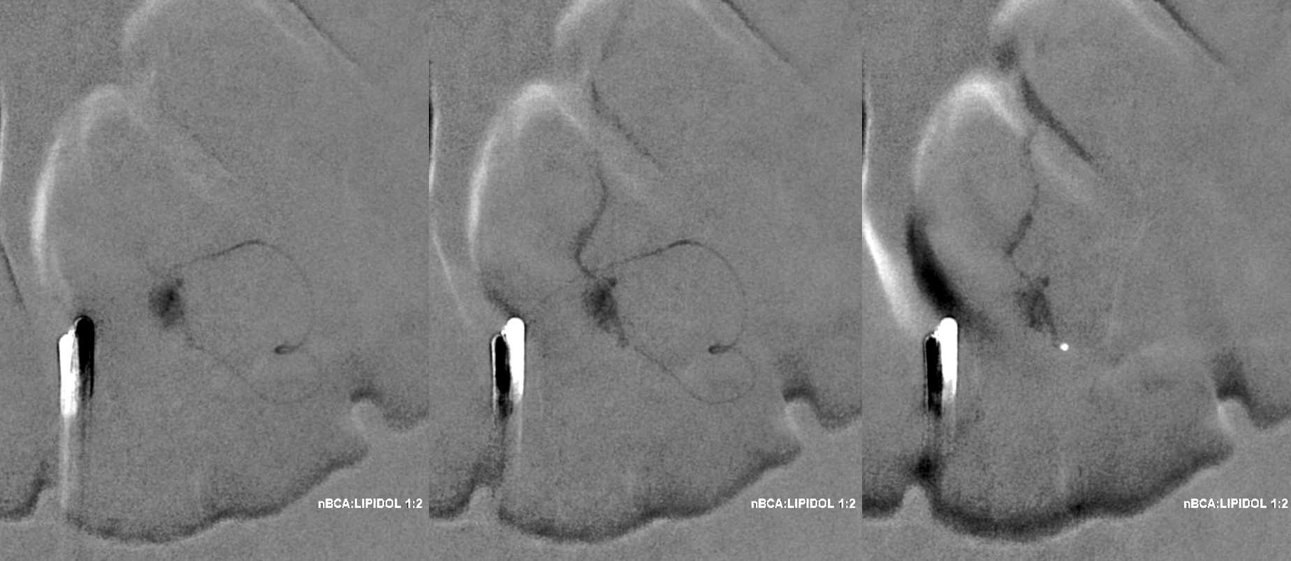 A 1:2 nBCA:lipidol dilution was chosen because of additional arterial inflows over which we had limited control (we usually use 1:1). Result seems good
