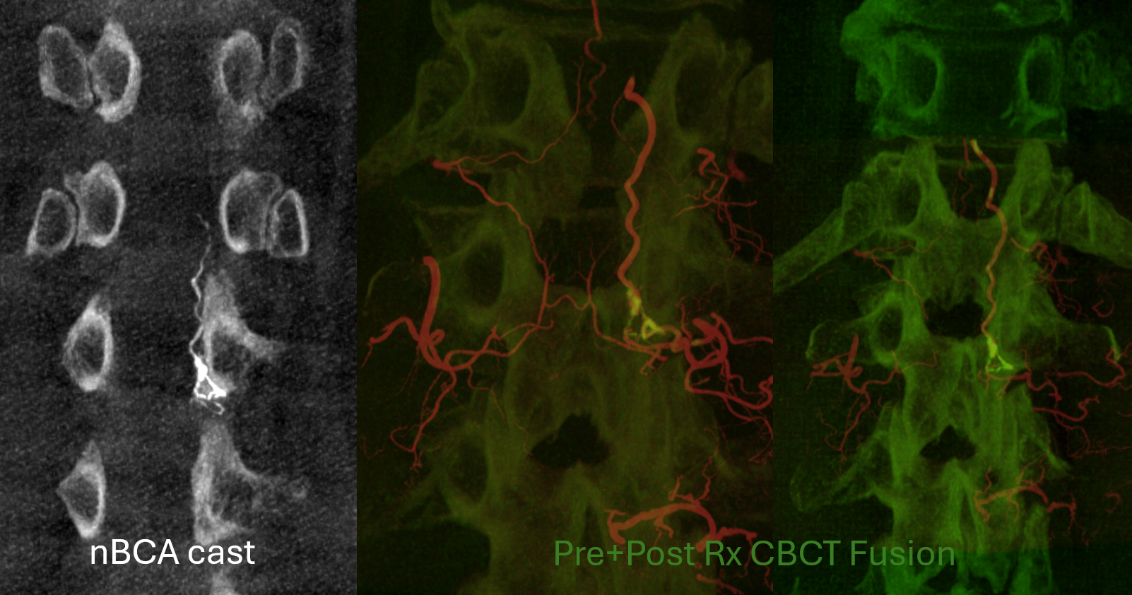 Cone Beam CT shows nBCA cast in the fistula basket and radicular vein. Fusion of pre and post Rx CBCTs is nice
